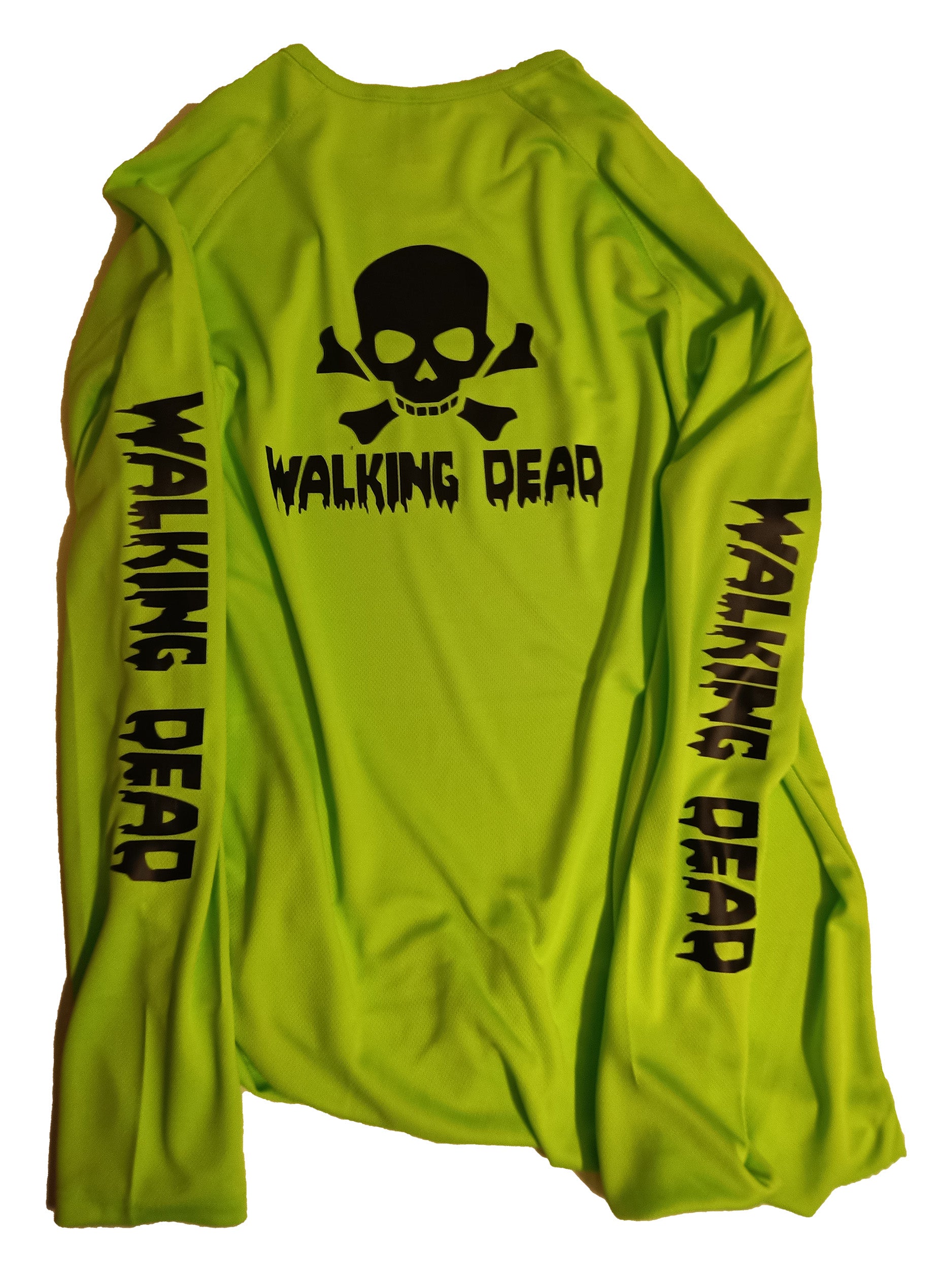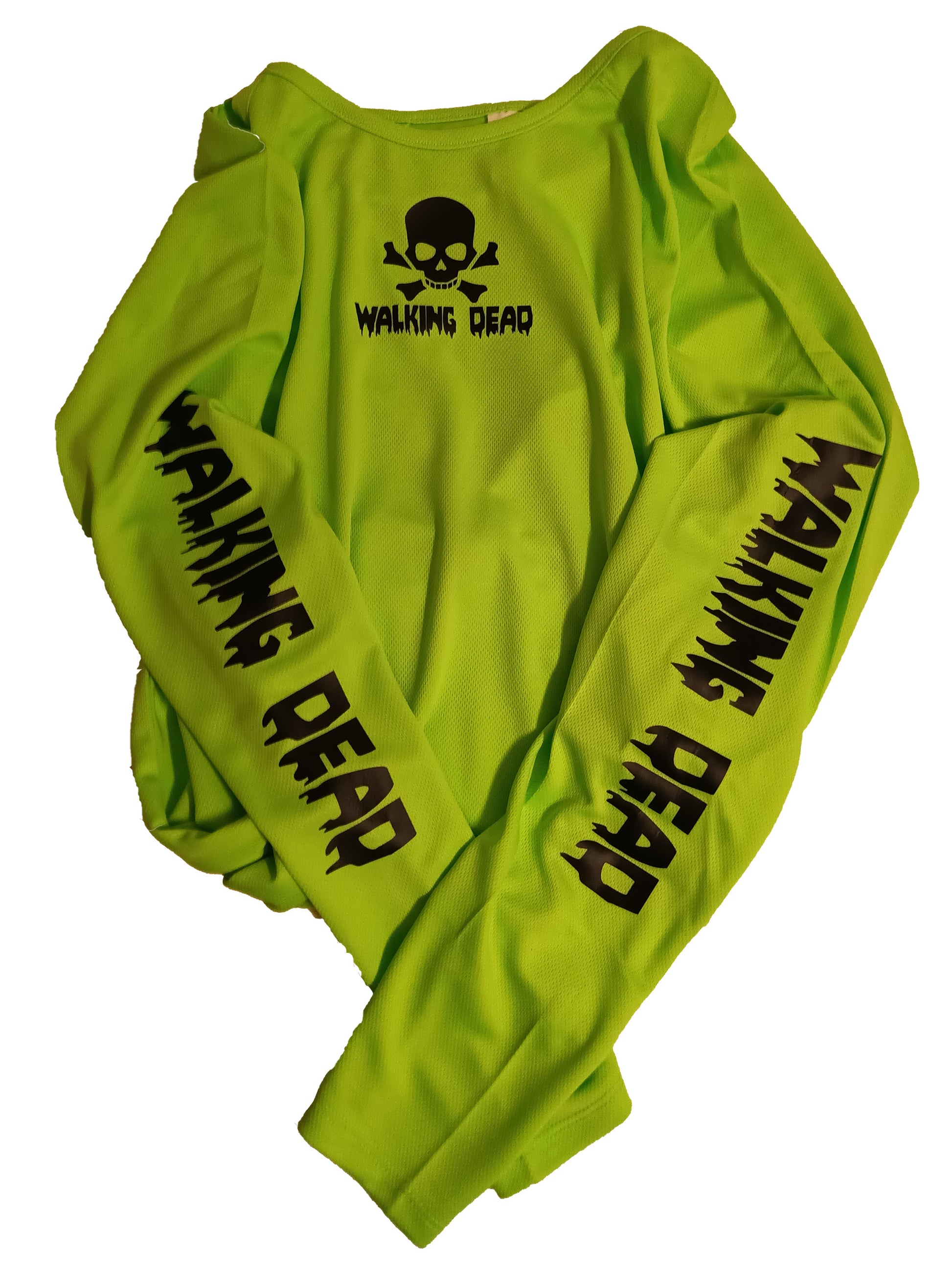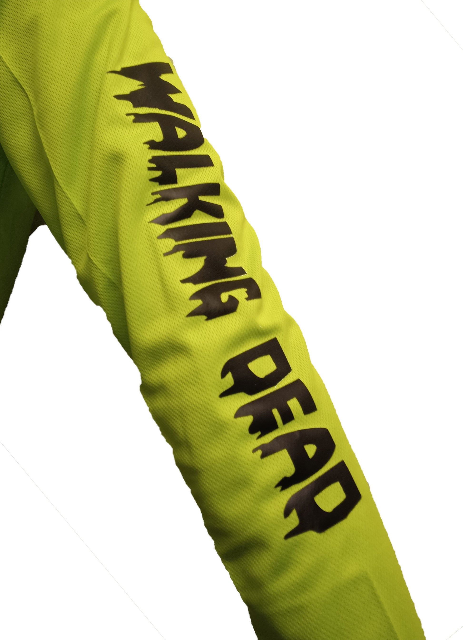 Tröjan har ett stort tryck på ryggen med Walking Dead-loggan. På magen finns ett mindre tryck med lagets namn och logotyp. Ärmarna är också prydda med Walking Dead-tryck.